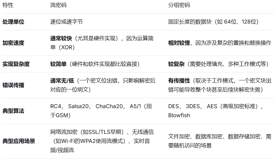 原理 :流密码的核心是生成一个与明文长度相等的、看似随机的密钥流(KeyStream)。然后,将这个密钥流与明文进行逐位(通常是一个比特或一个字节)的异或(XOR) 运算,从而得到密文。