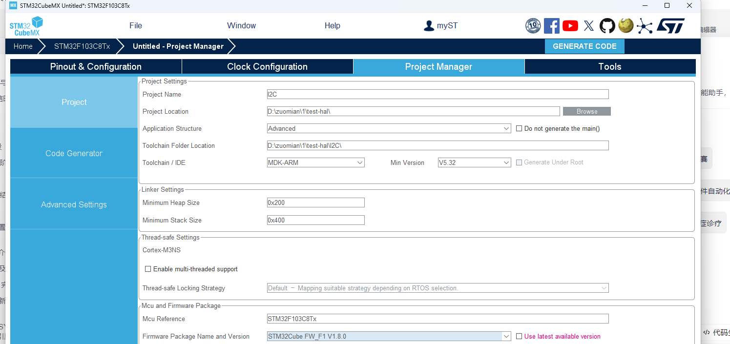 给项目取名、设置位置、选择开发的工具链,再点击GENERATE CODE生成