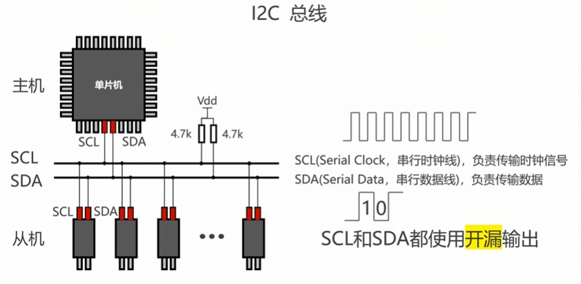 主机和从机各有SCL、SDA引脚,两种引脚各自与I2C总线的SCL、SDA引脚相连;