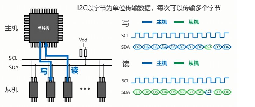 关键:无论读写,SCL 始终由主机控制,仅 SDA 的收发方互换。