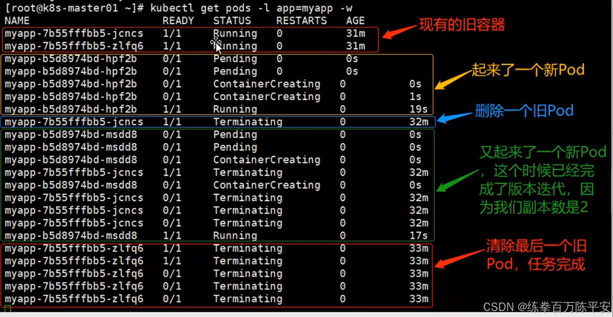 部署的时候,使用的镜像myapp:v1,更新的时候,修改deployment文件修改镜像为myapp:v2