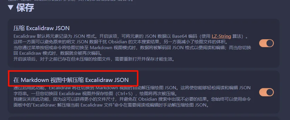 安装Excalidraw创建 设置如下 保存里开启"在 Markdown 视图中解压缩 Excalidraw JSON"