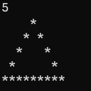 2.写代码的过程,矩阵通过两层for循环,注意层数和输入进来的toterLevel有关系,而星星的数量是层数的两倍减1,构建一个起来了一个框架,在歪三角金字塔中观察第一层有一个星星,第二层有三个,第三层有5个第四层有7个,第五层有9个,和层数呈二倍减一的现象。然后将歪三角扶正,第一层有四个空格,第二层有三个以此递减,和层数呈现出totel-i这个特性,然后将金字塔内部掏空,只留下第一个和最后一个,上面说过星星是被空格挤压到相应的位置的,这个时候只需要留下j=1和j=2*i-1,注意这里,这个地方有点绕。最后再加上一个判断,当是第五层的时候保留所有的星星。