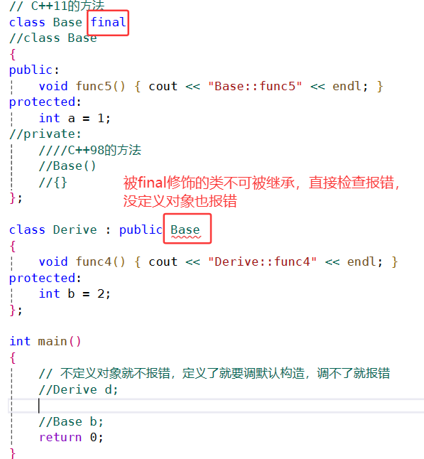 5)使⽤关键字class时默认的继承方式是private,使用struct时默认的继承方式是public,不过最好显式的写出继承方式。