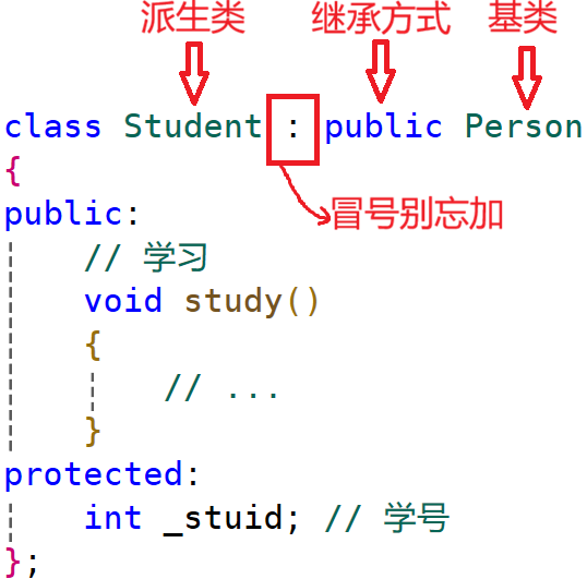 1)代码可以复用的最重要的手段,它允许我们在保持原有类(基类/父类)特性的基础上进行扩展,增加方法(成员函数)和属性(成员变量),这样产生新的类,称派生类/子类。(基类对应派生类,父类对应子类,最好不要混用)
