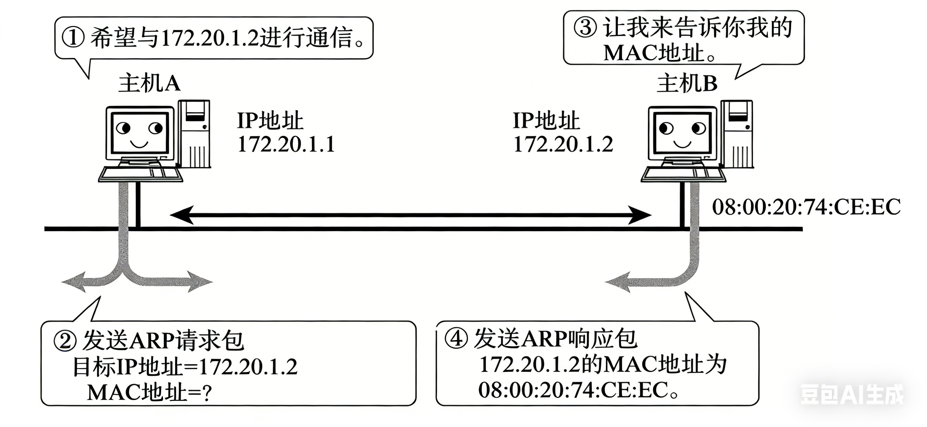 - ARP 应答 :只有 IP 地址匹配的目的主机,会单播回复ARP 应答 ,将自身 MAC 地址告知源主机,完成 IP→MAC 的地址映射。