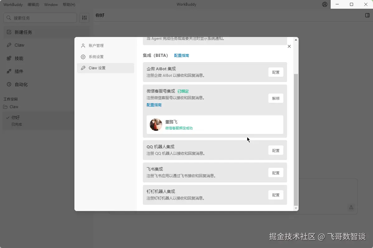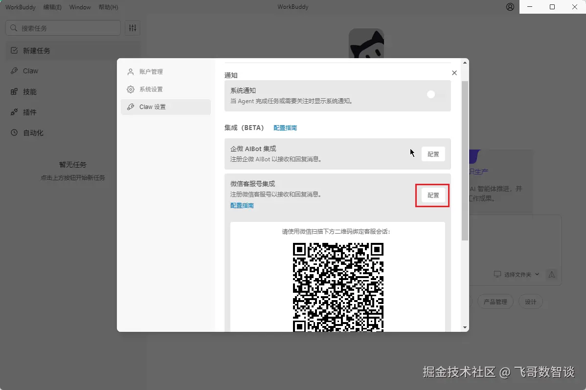 第3步,打开"Claw设置"-"集成"-"微信客服号集成",点击"配置"。