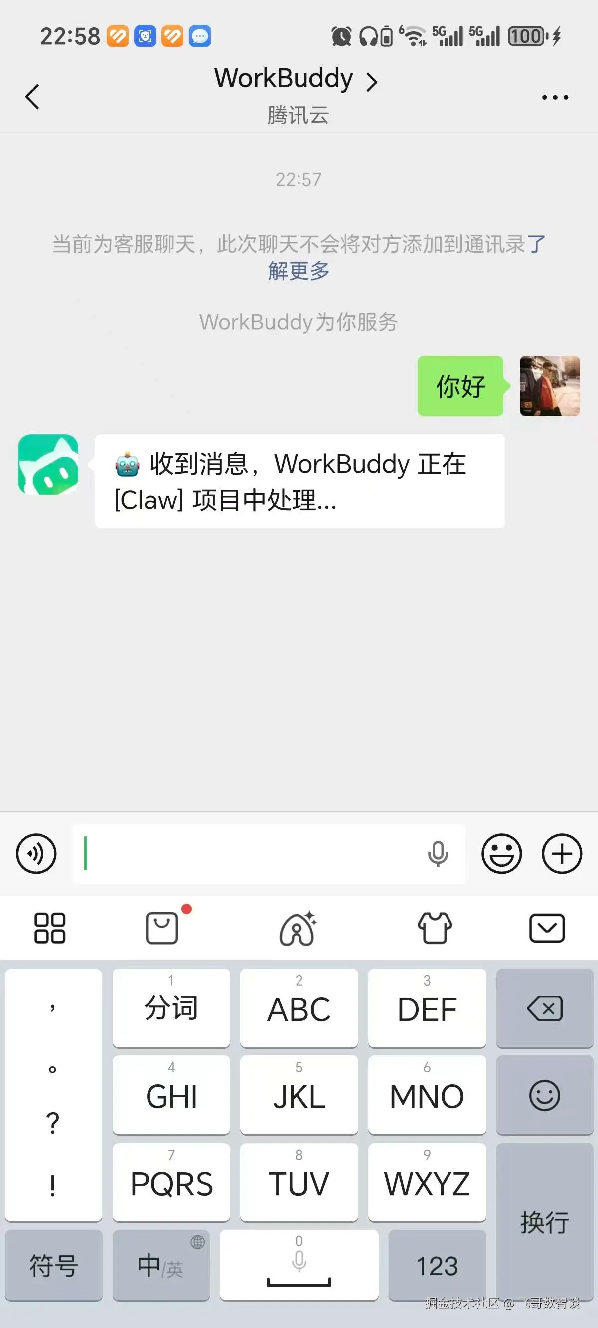 但是,此时你聊天的对话是在客服消息中,就是常规微信对话列表中仅有一个折叠入口的"客服消息",展开后还需要再点击"WorkBuddy",才能进入到上面的对话界面,比较麻烦。