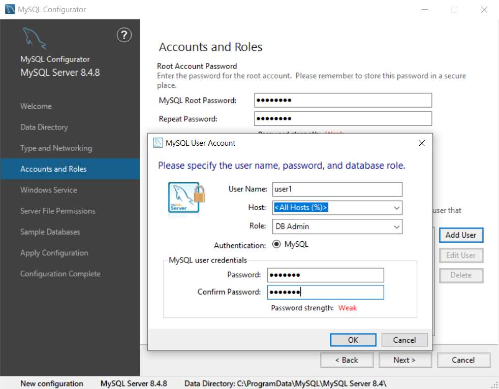 设置root用户的密码,同时增加两个用户user1和user2,user1和user2的用户权限如下图所示。user1用来进行数据库的连接,创建,数据插入等操作,user2用来查阅数据。
