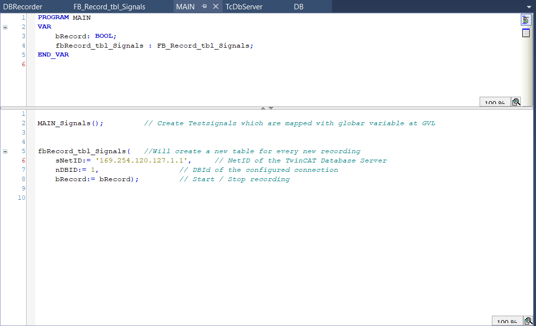 修改代码中的配置如下图所示,其中 sNetID为MySQL安装的控制器的AMSNetID,nDBID为项目中DB节点下的ID号