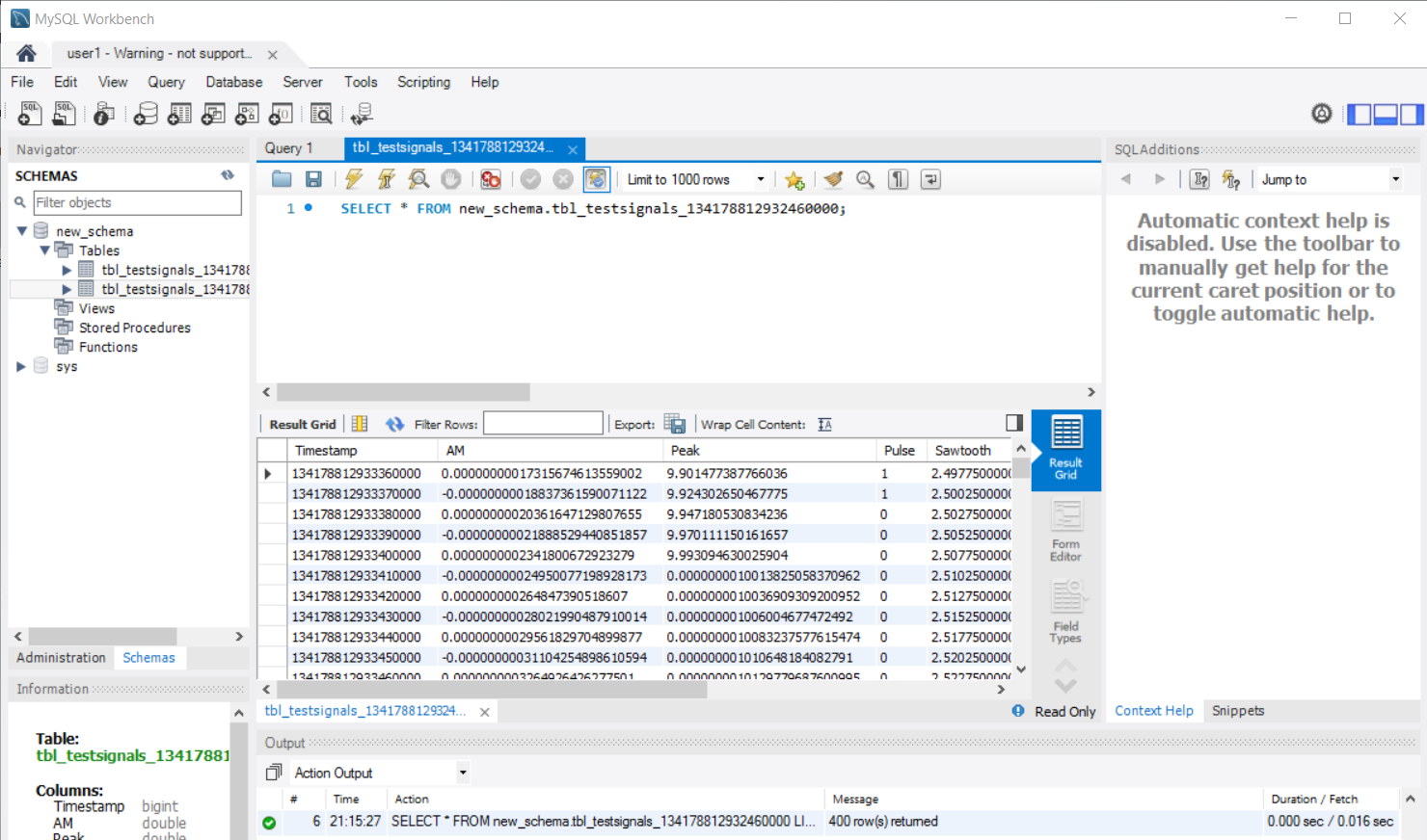 在Workbench中打开相应的schema查看已经新建成功table,并且写入了数值,其中Timestamp间隔为 10000 ∗ 100 n s = 1 m s 10000*100ns=1ms 10000∗100ns=1ms