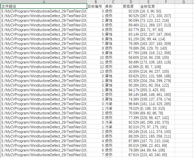 图片文件保存的csv文件内容如下,包括图片路径、目标在图片中的编号、目标类别、置信度、目标坐标位置。