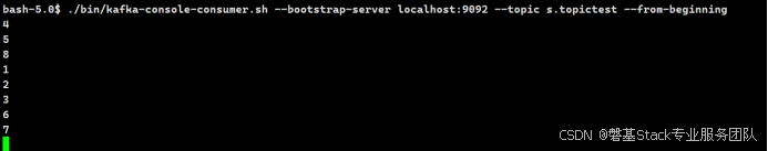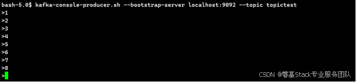 bash-5.0$ kafka-console-producer.sh --bootstrap-server localhost:9092 --topic topictest