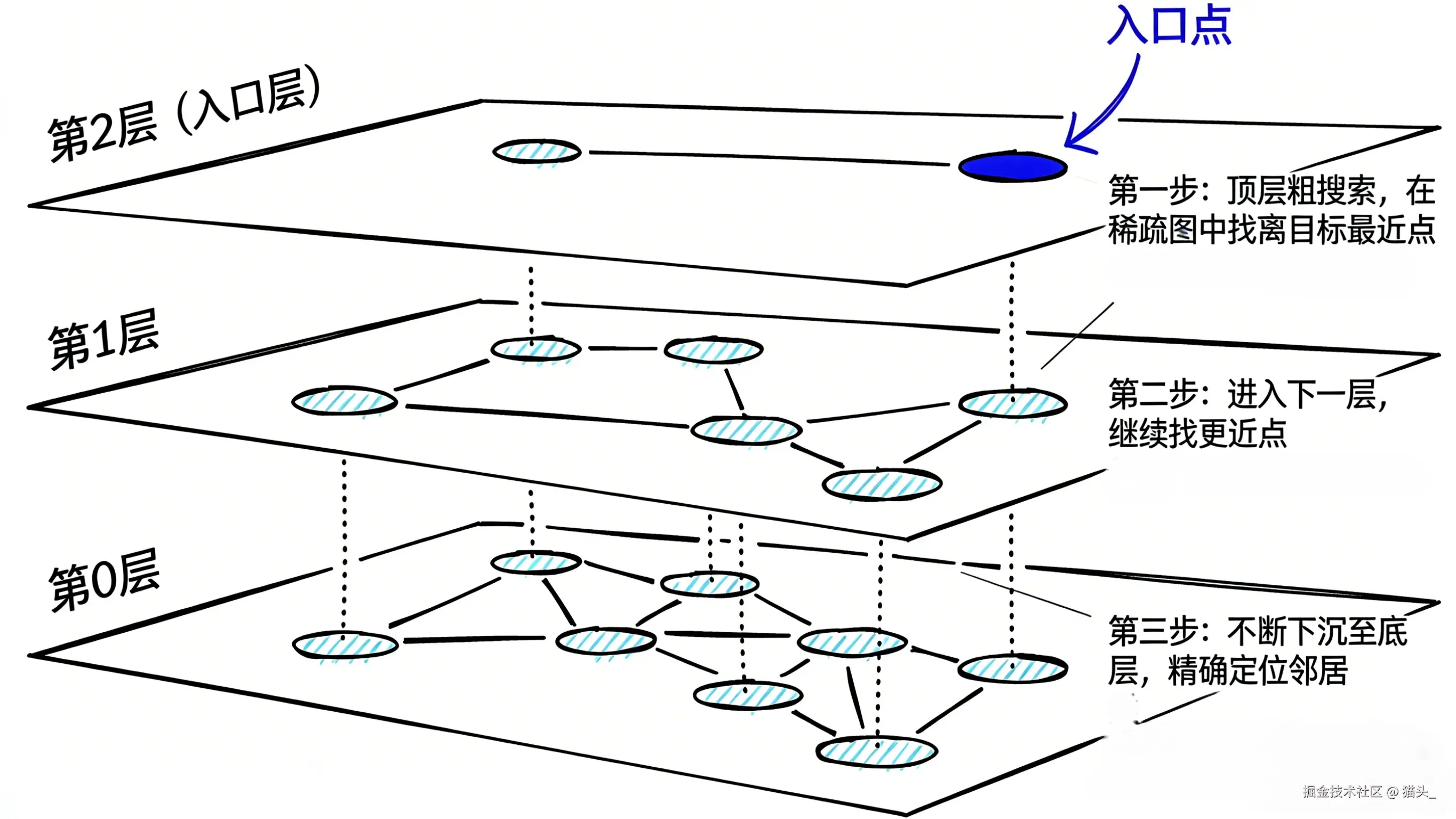 - 从顶层开始,先在一个很稀疏的图中找到离目标最近的点。