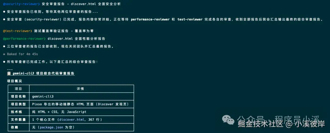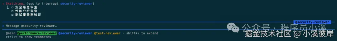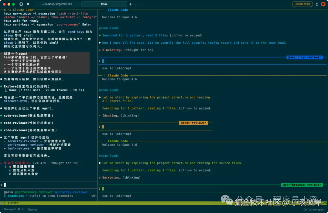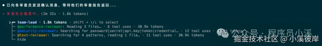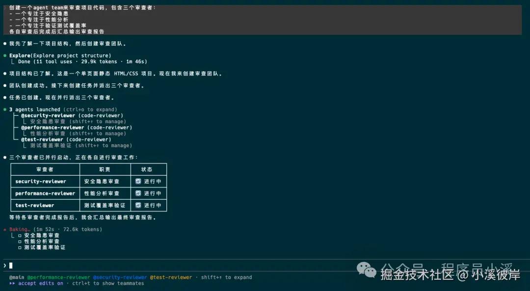 可以看到Claude Code创建了3个审查Agent,并为每个队友分配了不同的角色职责