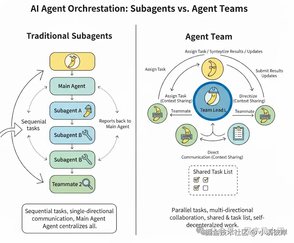 下面是AI绘制的Subagnet和Agent Team的协同工作的交互图,感觉还是挺形象的