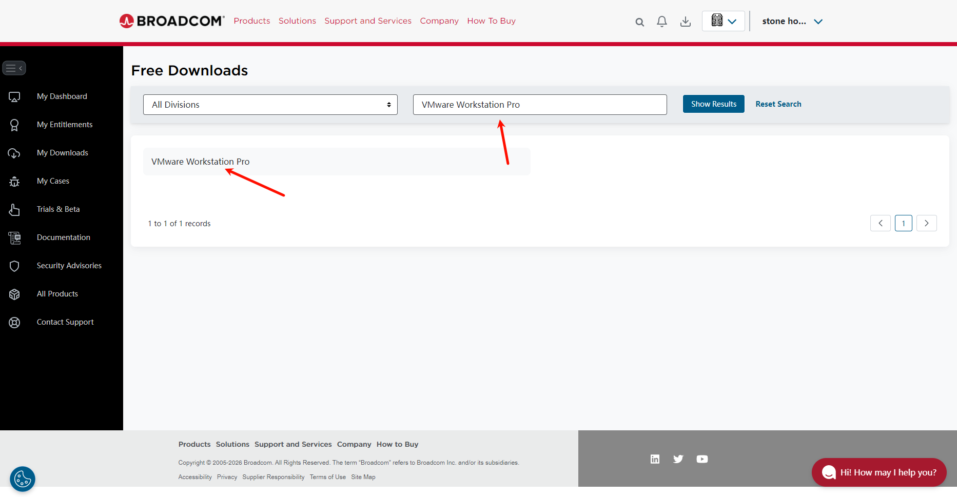 搜索VMware Workstation Pro,点击结果,并选择VMware Workstation Pro 25H2 for windows