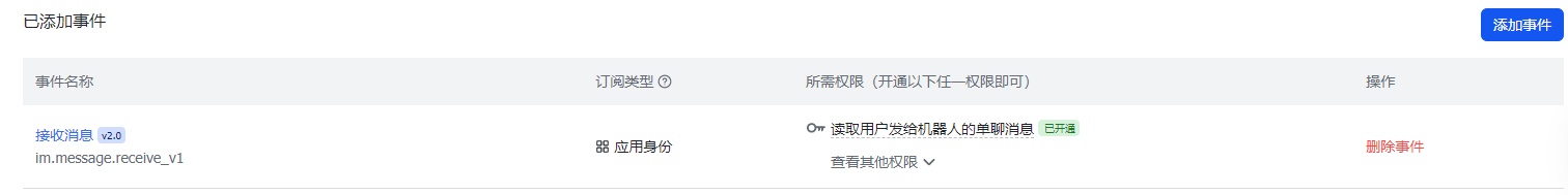 4.2选择「接收消息」事件。事件添加完成之后,配置开通权限。