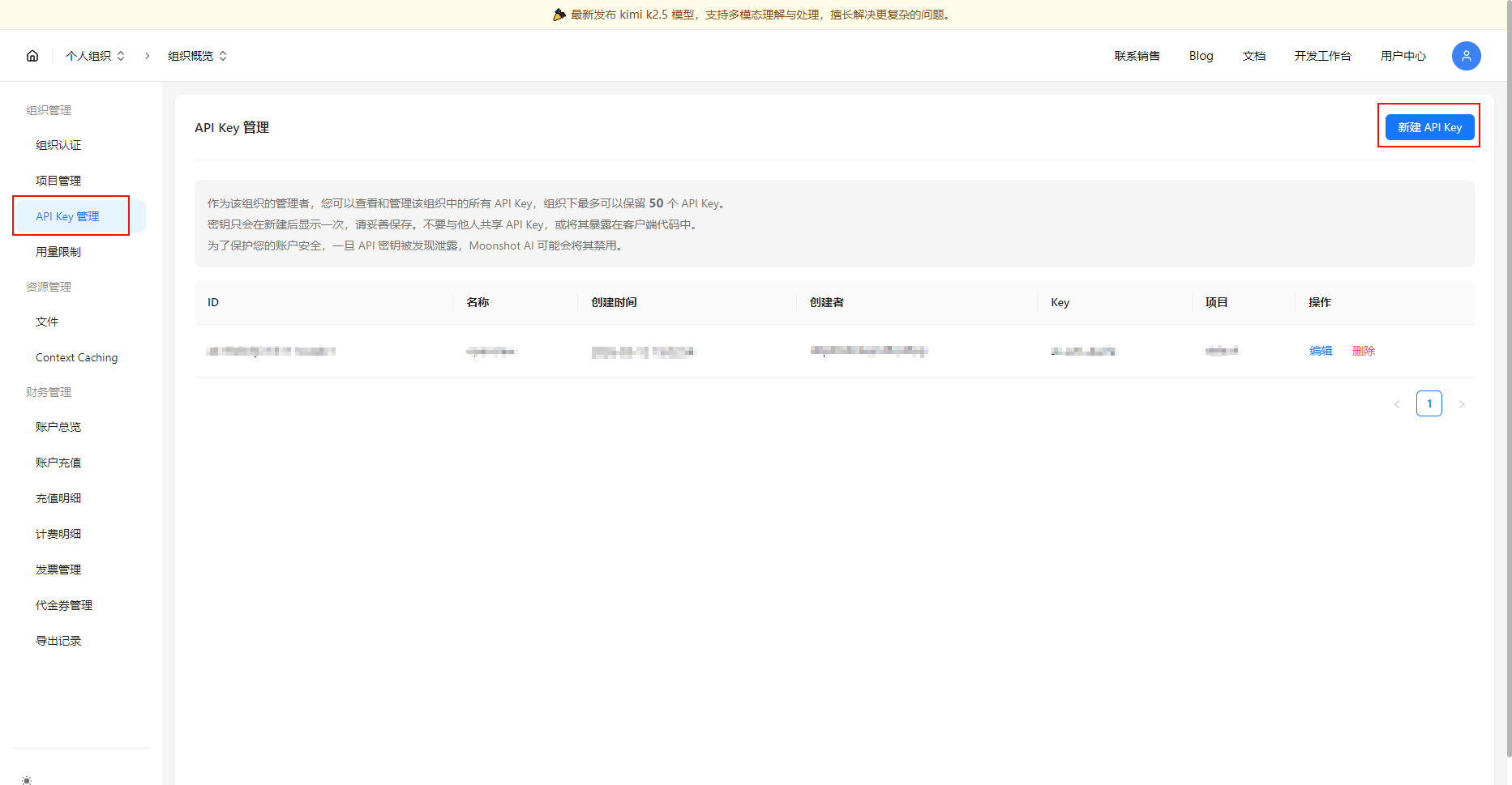 注意!!!获取后一定保存API key,此key只会出现一次,你无法再次查看