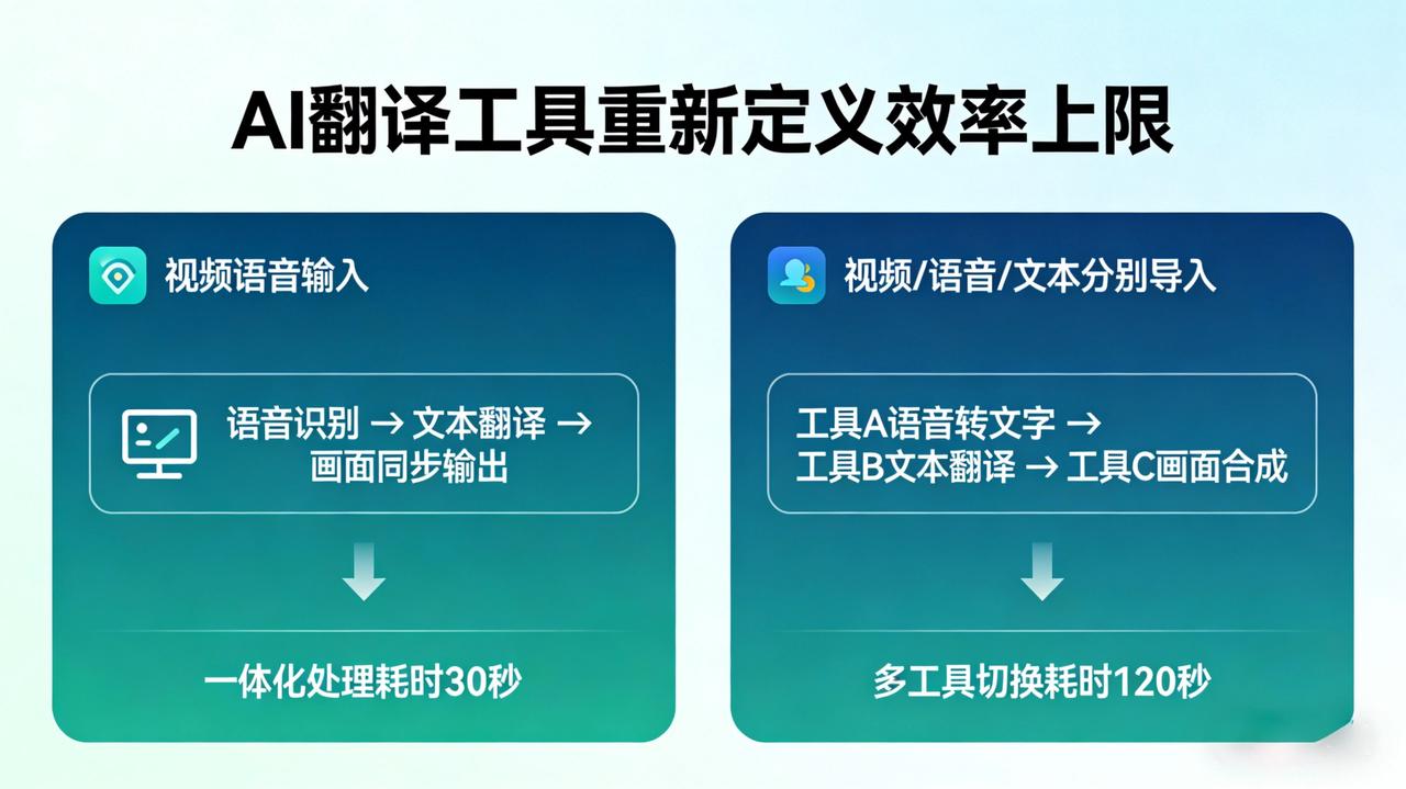 传统流程里,语音转写、画面字识别、翻译 是三个独立环节,需要用三个不同的工具来回切换。AI翻译工具把这三步整合了------导入视频后,它同时处理语音内容和画面文字,直接输出包含完整翻译的文本。仅这一个整合,就能节省将近40%的总工时。