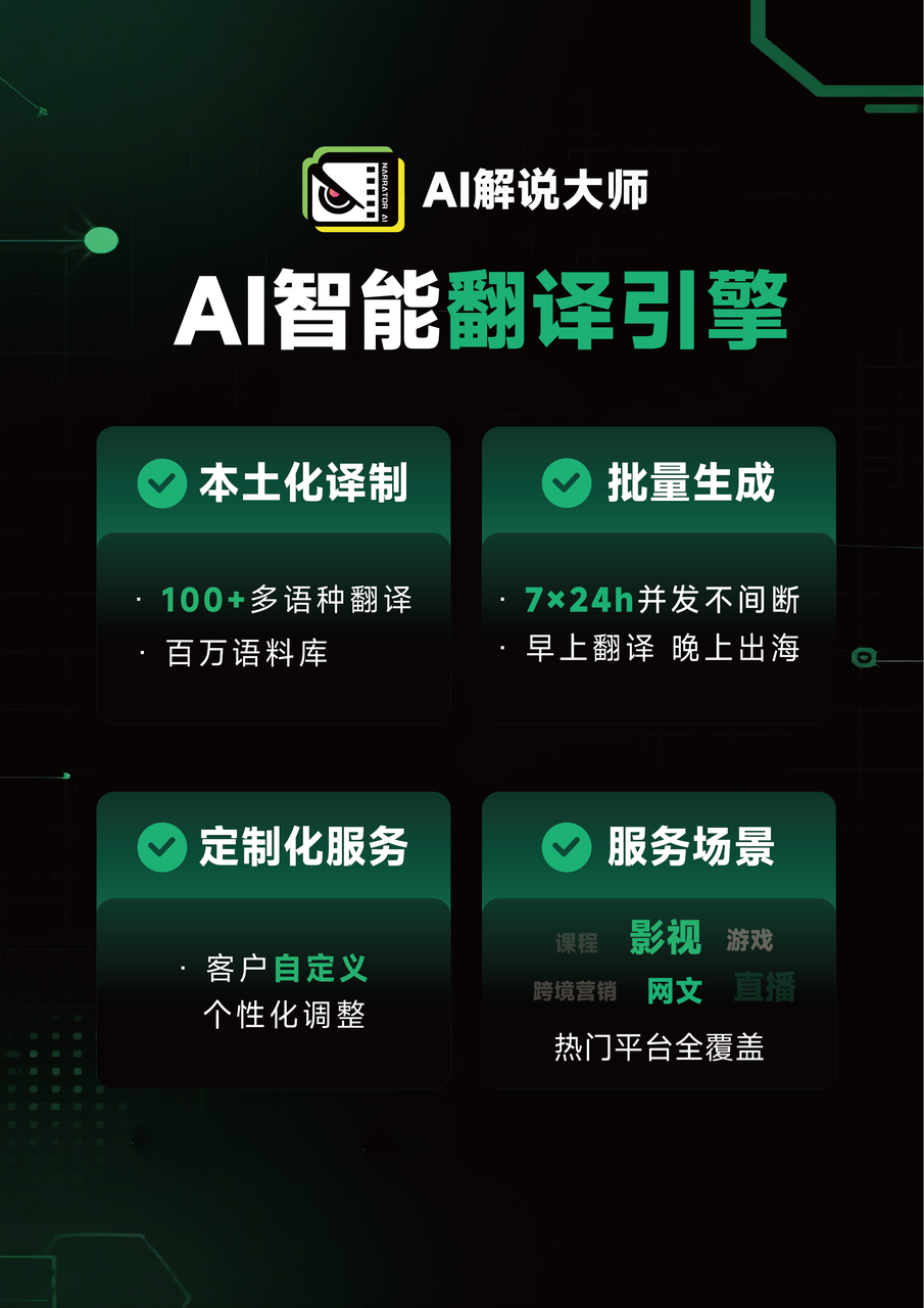 我个人目前在用的是AI解说大师,它在视频内容解析和短剧对白翻译上的完成度很高,特别是画面字自动识别和口语化输出这两块做得不错,推荐有同样需求的朋友体验一下。有问题欢迎评论区聊,我会持续分享短剧翻译的实战经验。
