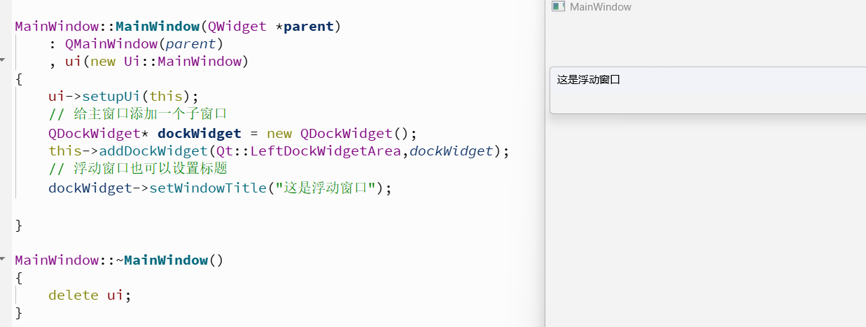若要给浮动窗口内部,添加一些其它控件,不能直接给这个浮动窗口添加子控件,而是创建出一个单独的QWidget,把添加的控件加入到QWidget中。然后把这个QWidget设置到dockWidget中: