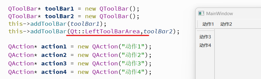 - Qt::AllToolBarAreas 以上四个位置都可停靠