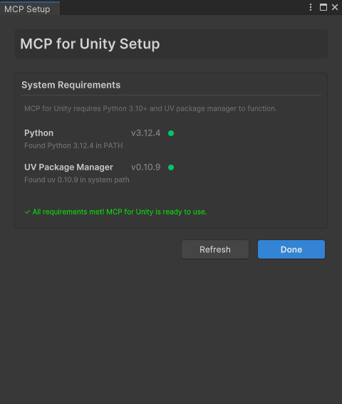💡 提示:Git和Unity通常是开发者已安装的,你只需要额外安装Python和uv即可。