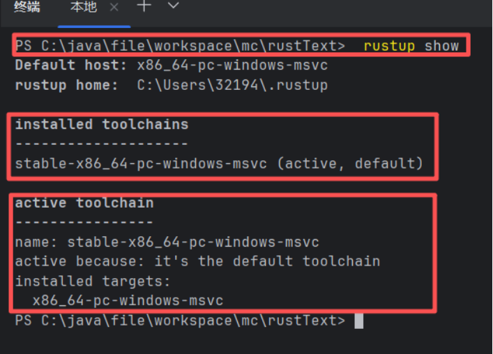 这显示了已安装的 Rust 工具链版本,其中 stable-x86_64-pc-windows-msvc 表示稳定版本的 Rust 工具链,适用于 x86_64 架构的 Windows 系统,使用 MSVC 工具链。(active, default) 表示这个工具链当前正在使用且是默认工具链。