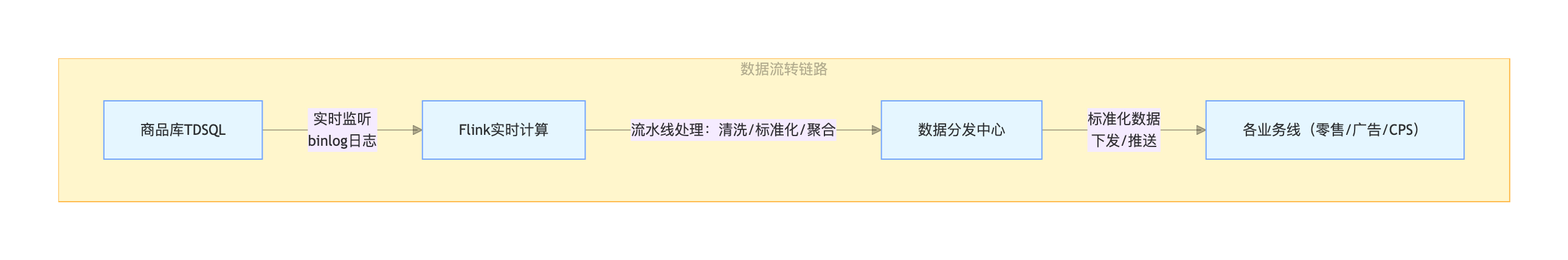 商品中台与下游业务线的核心交互方式为**"监听商品库 binlog 日志→Flink 流水线处理→标准化数据下发至各业务线"** ,该方式相较于传统的 "业务线调用中台 API 拉取数据",具备诸多核心优势,是架构设计的重要亮点: