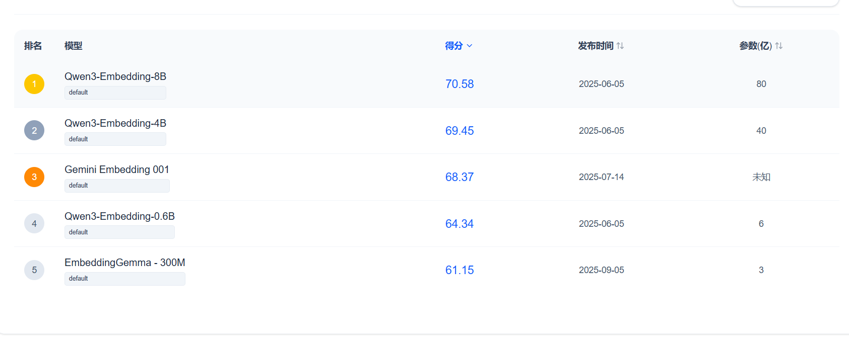 • 小范围对比测试 (Benchmark): 从MTEB榜单中挑选几款排名靠前且符合需求(如语言、维度)的候选模型。使用 "黄金"测试集,对这些模型进行评测