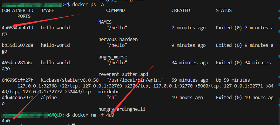 我们删除第一个id前面3位为4a0的容器,注意看一下图片我的命令。