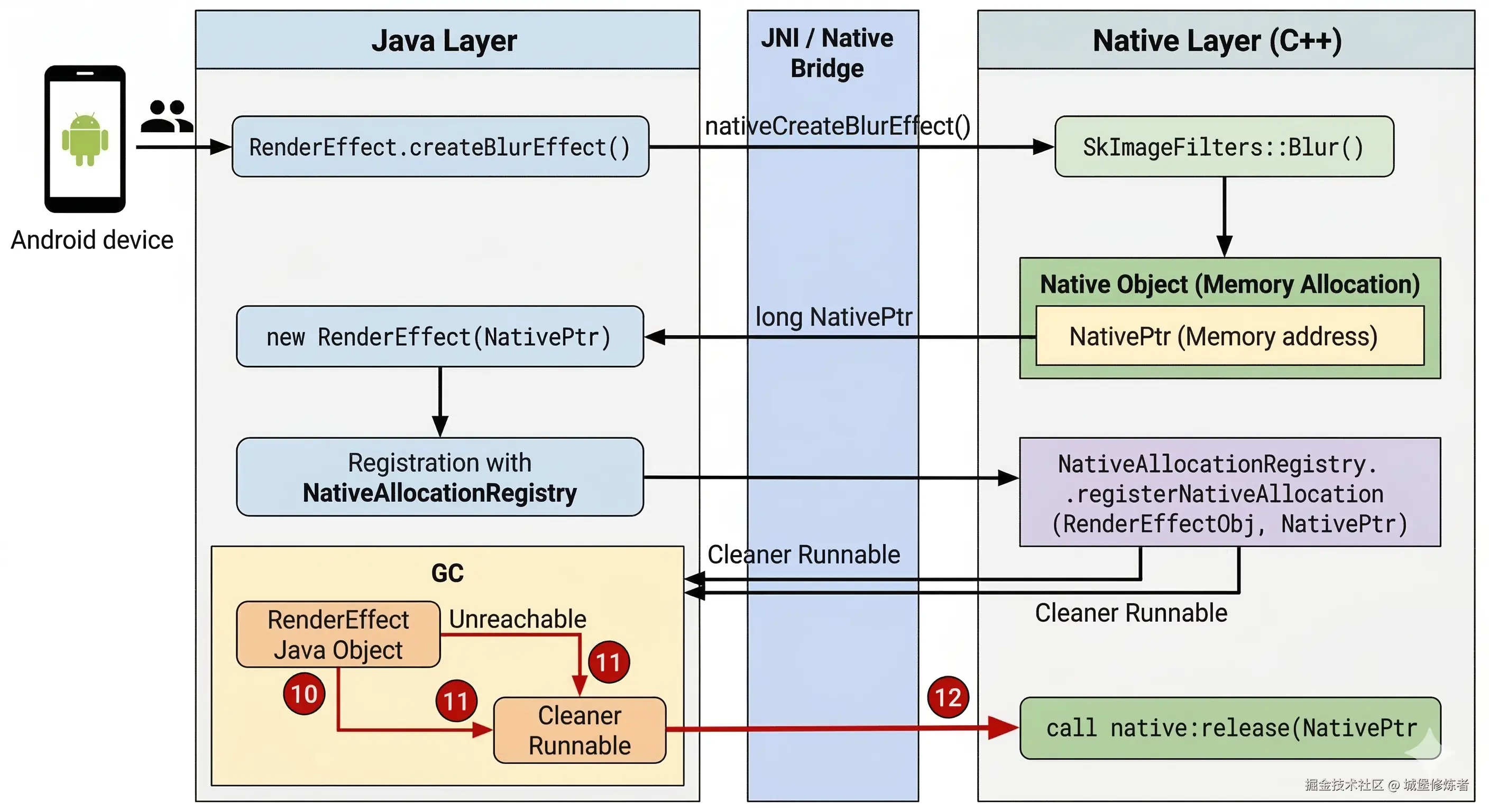 RenderEffect 的底层其实是通过c++引擎(如skia)来完成的,这就涉及到了 Java 层对象与底层 C++ 内存分配之间的桥梁------NativeAllocationRegistry 注册机制