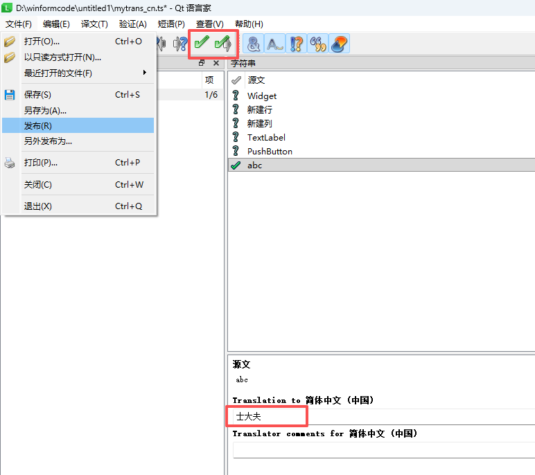 QT中常用的国际化方式,在代码中使用tr包裹所需要翻译的字符串,使用lupdate更新翻译文件,在Linguist中编辑所需要翻译的文字即可。