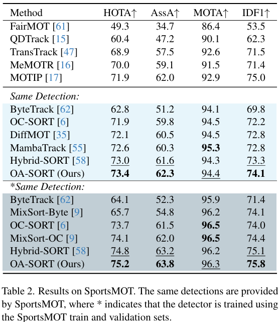 SportsMOT: 表 2 展示了 SportsMOT 的结果。结果表明,遮挡感知框架在变速运动和摄像头视角变化下仍然有效。这种有效性源于遮挡评估基于物体之间的相对位置。即使在短期的摄像头视角变化后,相对位置也能保持。值得注意的是,OA-SORT 在没有任何摄像头运动补偿的情况下取得了这些结果。此外,正如 [9] 所指出的,SportsMOT 对 IoU 和卡尔曼滤波精度的要求比 DanceTrack 更严格。结果进一步证实了所提出框架的有效性和泛化能力。它在涉及变速运动和高强度摄像头移动的遮挡场景下有效地增强了跟踪鲁棒性。