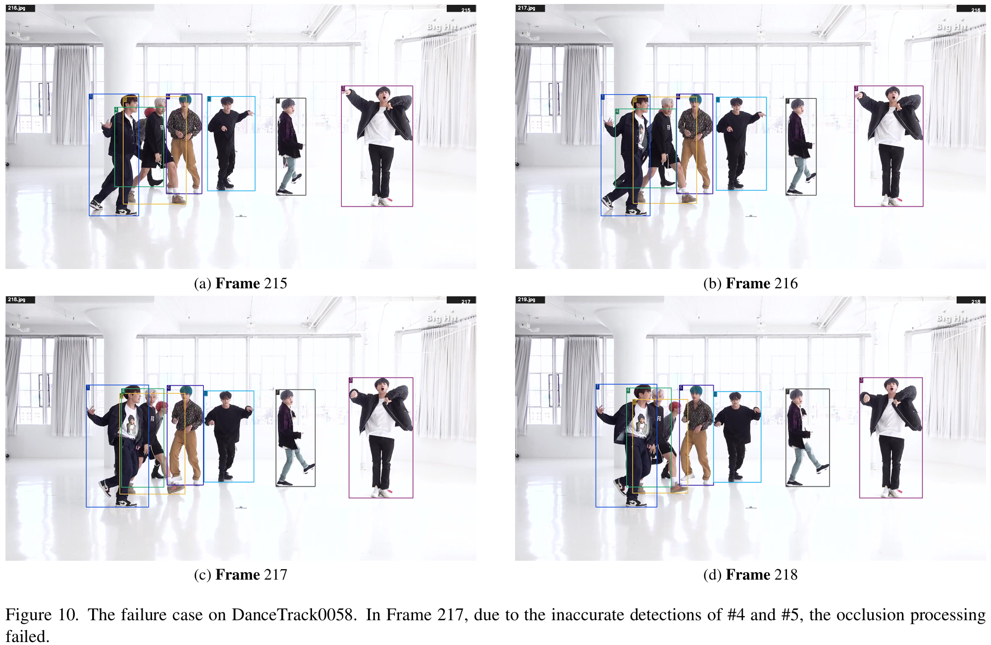 我们分析了 DanceTrack0005 在 Hybrid-SORT 和 OA-SORT 下的视频片段,如图 8 和图 9 所示。在第 66 帧(图 8 中),Hybrid-SORT 由于遮挡引起的位置代价混淆,未能保持 #3 和 #2 的 ID。相比之下,OA-SORT 利用 OAO 稳定了它们的 ID。然而,在强竞争下,遮挡感知框架难以处理严重的不准确检测,如图 10 中边界框 #4 和 #5 所示。