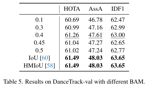 偏差感知动量: 为了减轻不准确检测的影响,BAM(第 4.3 节)结合了空间一致性指标 [58, 60] 和遮挡信息。存在替代配置,例如使用常数值代替空间一致性指标 [58, 60]。表 5 的结果表明,结合空间一致性指标 [58, 60] 进行自适应动量调整能取得更好的性能。为了减少额外计算,空间一致性指标可以跟随跟踪器。在此,遵循 Hybrid-SORT [58],OA-SORT 利用 HMIoU。