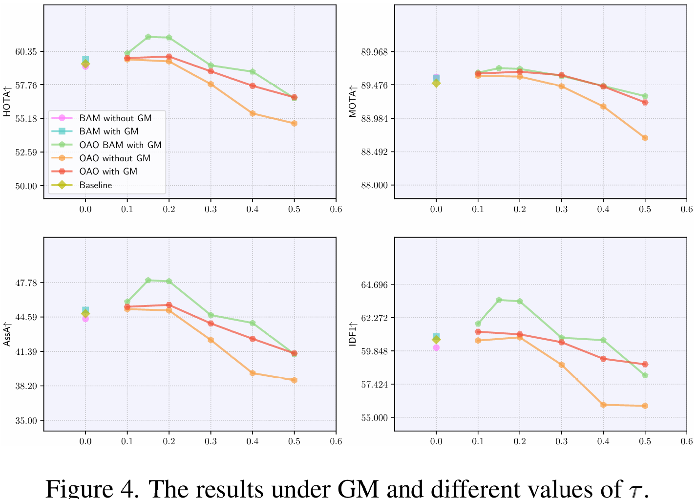 GM 和 τ\tauτ: 如公式 (8) 定义的较大的 τ\tauτ 减轻了由遮挡引起的不准确检测导致的位置代价混淆,但也可能破坏空间一致性表达。因此,我们在图 4 中展示了在不同 GM 和 τ∈[0.1,0.5]\tau \in [0.1, 0.5]τ∈[0.1,0.5] 值下 OAO 和 BAM 组件的跟踪性能,分析了不同配置下不同 τ\tauτ 的影响。总体而言,我们的结果与分析一致,即在 DanceTrack 上使用带有 OAO、BAM 和 GM 的跟踪器时,将 τ\tauτ 从 0.1 增加可以带来益处。然而,超过一定值增加 τ\tauτ 会因损害空间一致性而降低性能。其次,无论 τ\tauτ 如何,GM 都有效地增强了 OAO 和 BAM 组件的性能。