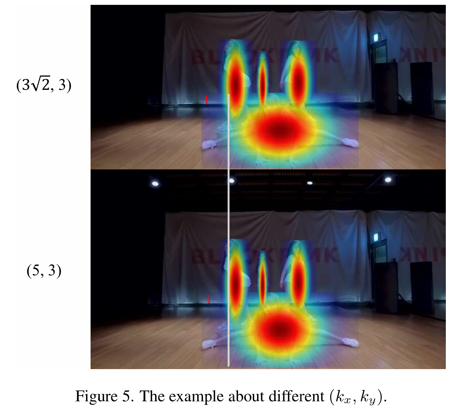 该结果主要显示了在 DanceTrack 验证集上的近似全局最优解。然而,当 kxk_xkx 或 kyk_yky 较大时,高斯分布可能会像图 5 所示那样容易变得混乱。为了避免 kxk_xkx 和 kyk_yky 的特殊性,我们尝试减小 kxk_xkx:kx:ky=3∗2:3=1.414:1k_x : k_y = 3*\sqrt{2} : 3 = 1.414 : 1kx:ky=3∗2 :3=1.414:1,因为公式 (5) 中的二次项 (σxn)2(\sigma_x^n)^2(σxn)2 以及 kx∈(4,5)k_x \in (4, 5)kx∈(4,5)。表 11 的结果与我们一致,即在 DanceTrack 测试数据集上,当 kx=(3∗2,3)k_x=(3*\sqrt{2}, 3)kx=(3∗2 ,3) 时性能更好。最后,σxn\sigma_x^nσxn 和 σyn\sigma_y^nσyn 分别设置为 wn3∗2\frac{w_n}{3*\sqrt{2}}3∗2 wn 和 hn3\frac{h_n}{3}3hn。