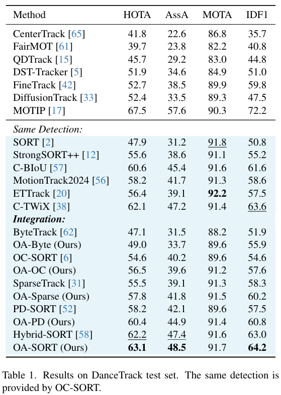 DanceTrack: 如表 1 所示,OA-SORT 相比基线 Hybrid-SORT [58] 取得了一致的增益(+0.9 HOTA, +1.1 AssA, +0.1 MOTA, +1.2 IDF1)。AssA 和 IDF1 的改进表明遮挡感知框架有效缓解了代价混淆并细化了 KF 估计。值得注意的是,Hybrid-SORT 已经利用运动方向线索来减轻遮挡影响。此外,将遮挡感知集成到其他跟踪器------ByteTrack (OA-Byte), OC-SORT (OA-OC), SparseTrack (OA-Sparse), 和 PD-SORT (OA-PD)------一致地提高了它们的性能。虽然 PD-SORT [52] 和 SparseTrack [31] 利用伪深度设计空间一致性指标 (DVIoU) 和关联策略 (DCM),但遮挡感知框架的集成进一步提高了性能。总体而言,结果表明建模和利用遮挡状态能有效处理非线性和交互式运动场景。