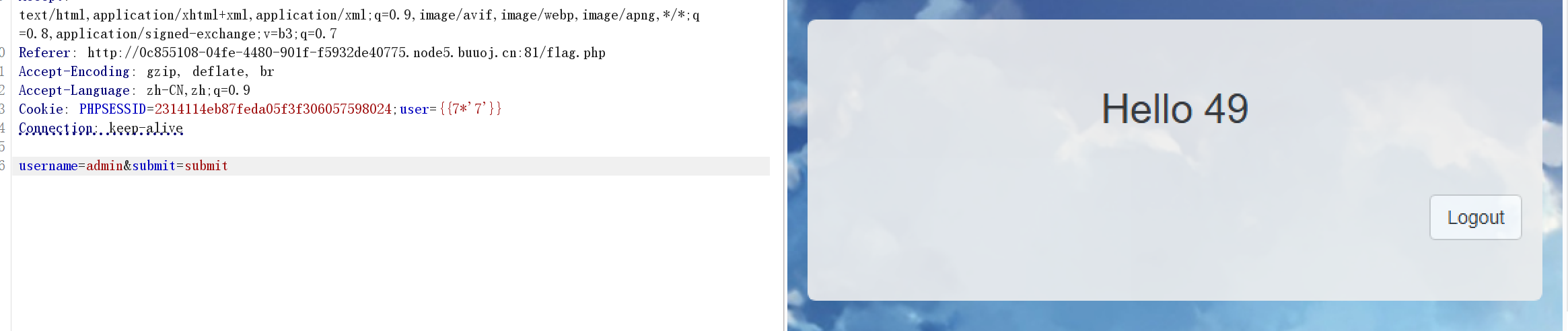 题目描述跟cookie有关,然后在flag.php中输入的值作为cookie传入,但是刚开始的时候没找到什么利用点,扫目录啥的也没什么结果,看了wp之后才发现是SSTI(看来以后输入框啥都要试一试),这里是抓包后的画面: