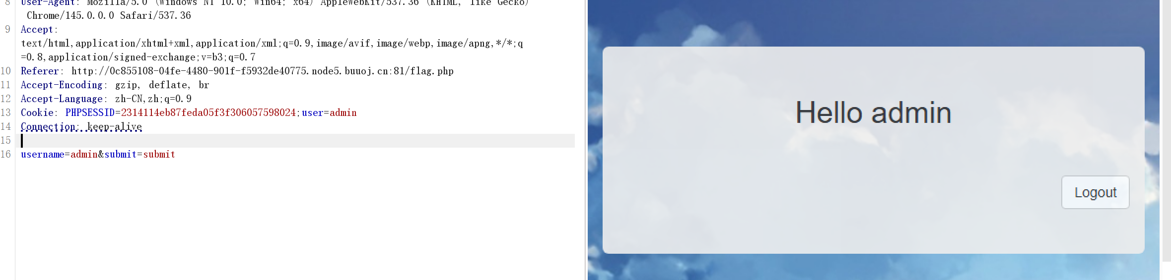 刚开始的时候改的是username发现没啥用,然后因为题目描述说cookie,那么就尝试一下换到cookie中去: