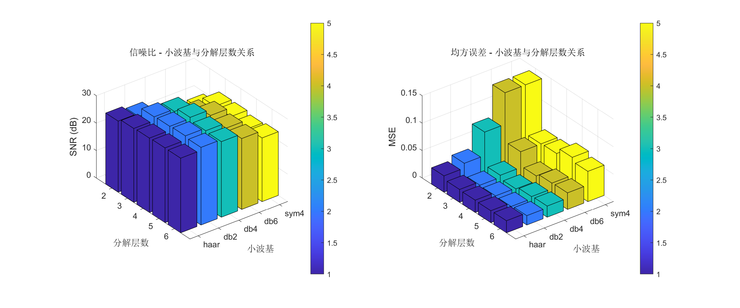 小波分解、5种阈值选择方法(rigrsure/heursure/sqtwolog/minimaxi/visushrink)、5种阈值函数(软/硬/改进1/2/3)、信号重构和性能评估(SNR/MSE/NCC)。