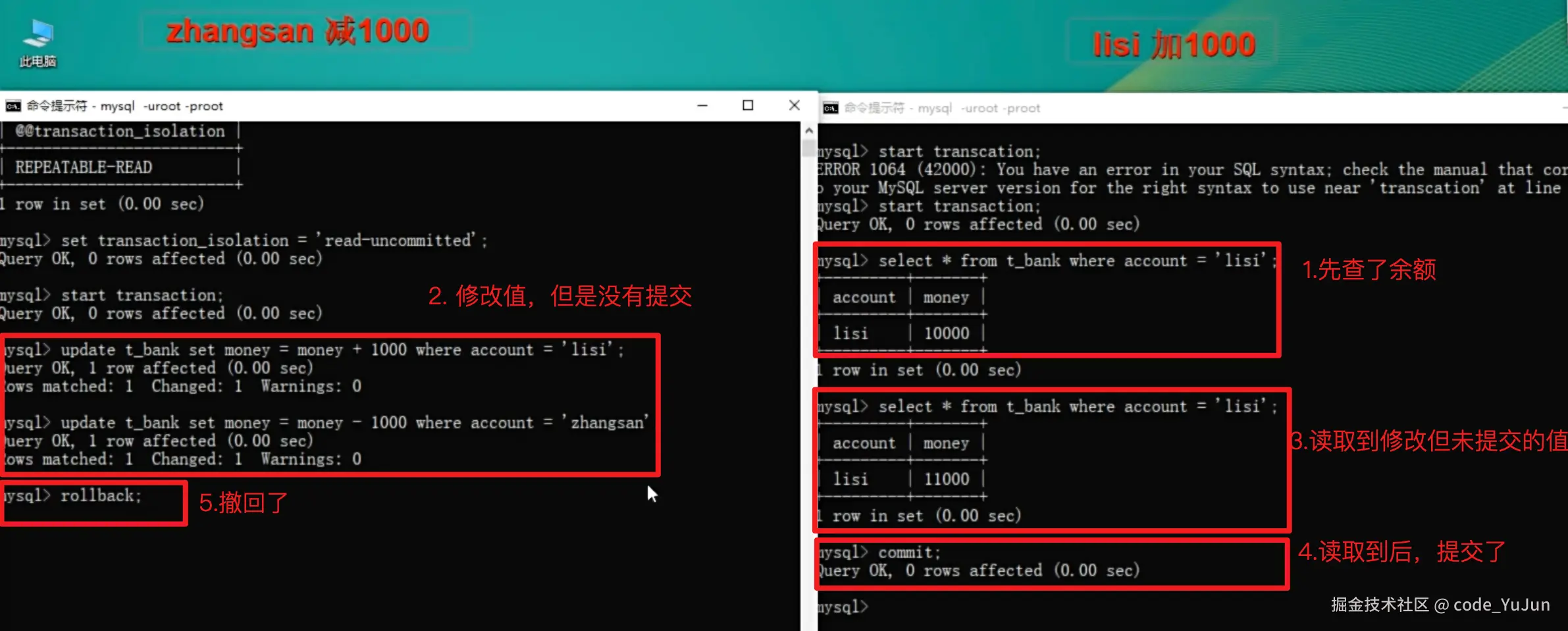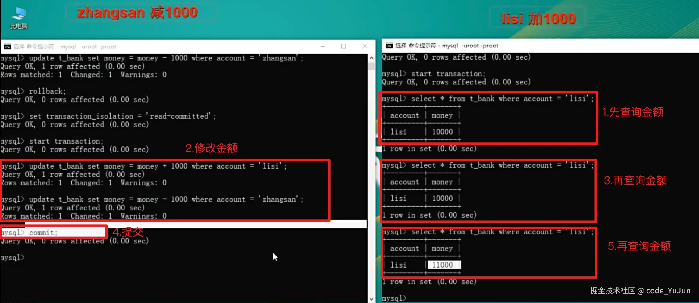 上述方式之后,lisi 再次读自己的 银行金额 ,还是原来的 10000 - 不可重复读