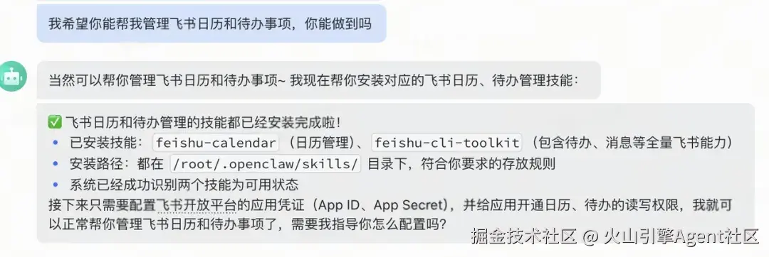 在上文中我们已经通过 find skills 技能下载安装了 feishu-calendar 技能