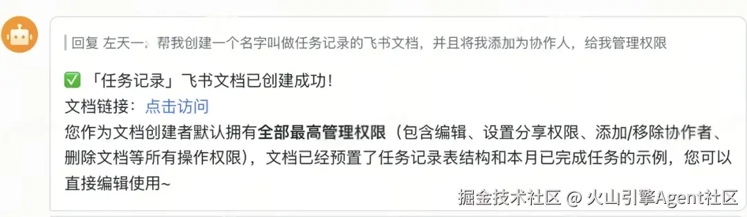 帮我创建一个名字叫做任务记录的飞书文档,给我管理权限