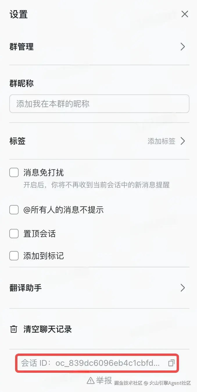 在群设置页面底部,找到对应的群 ID,并复制(飞书需升级到 7.60 以上版本)