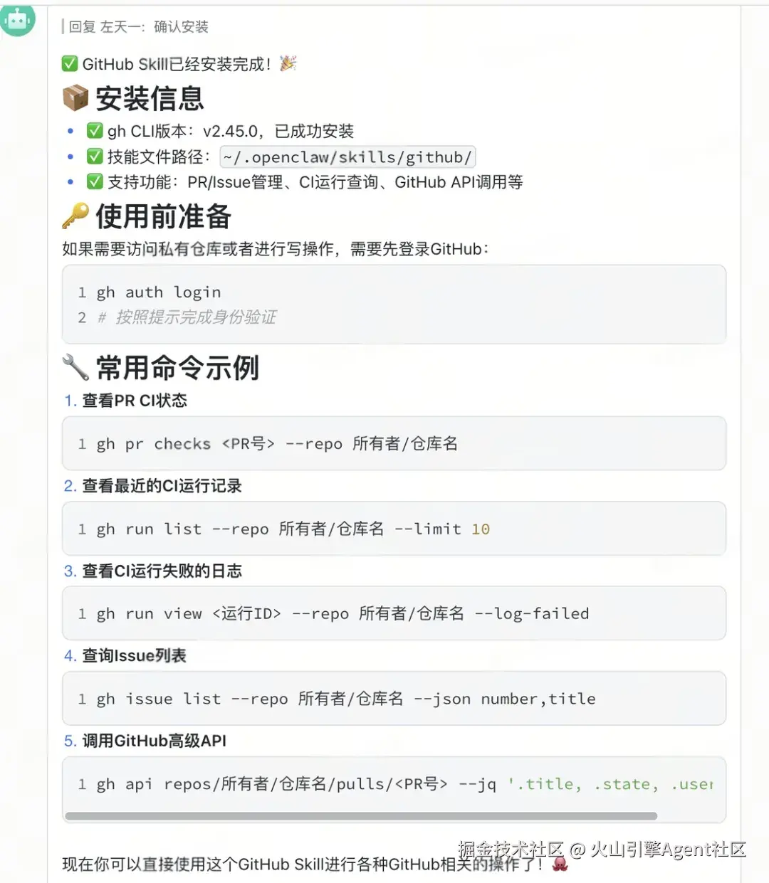 此技能是一个纯指令集合,它指导 AI 智能体如何使用 GitHub 官方的命令行工具 gh。因此,核心是安装 gh。安装 gh CLI