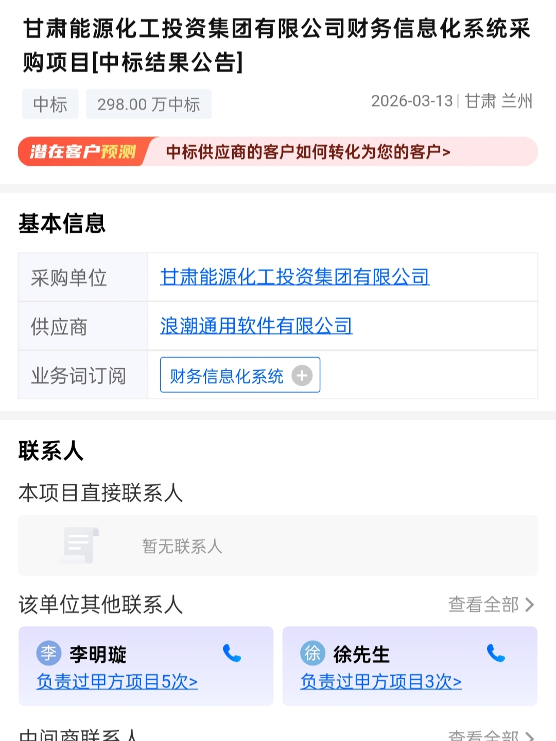 2026年3月13日,甘肃兰州发布甘肃能源化工投资集团有限公司财务信息化系统采购项目中标结果公告。该项目中标金额为298.00万元,由浪潮通用软件有限公司中标,采购单位为甘肃能源化工投资集团有限公司。