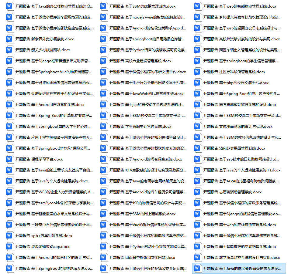 以上是某同学的毕业设计答辩的过程,如果你现在还没有参加答辩,还是开题阶段,已经选好了题目不知道怎么写开题报告,可以下面找找有没有自己符合自己题目的开题报告内容,列表中的开题报告都是往届真实的开题报告,可发送使用或参考。文末或底部来联xi可免费获取
